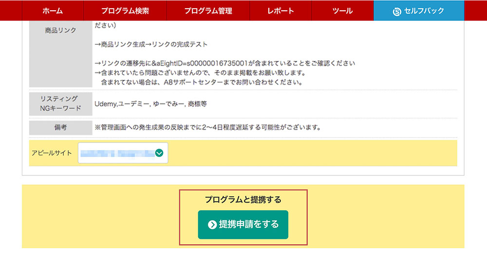 下へスクロールして「提携申請をする」をクリックします。